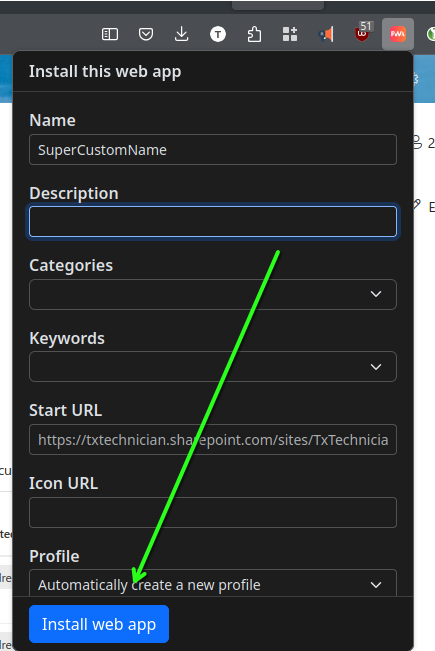 Because the only sites you'll surf in the PWA is the site you have installed. In this case, it's just my Microsoft Tenant. So I have no reason to install an adblocker. And I don't want Microsoft to be able to see my regular browsing history and info from my main FireFox profile.