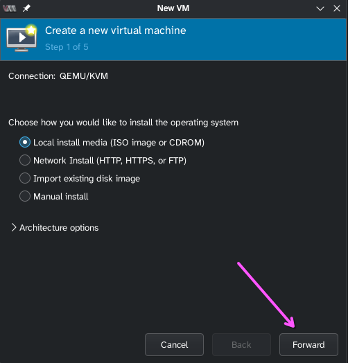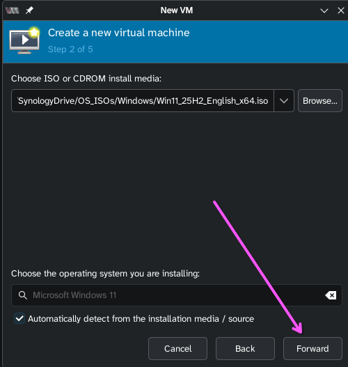 - ISO should already be selected, just click Forward (you should have already downloaded an ISO from the internet: Mint, Fedora, Windows, etc...)